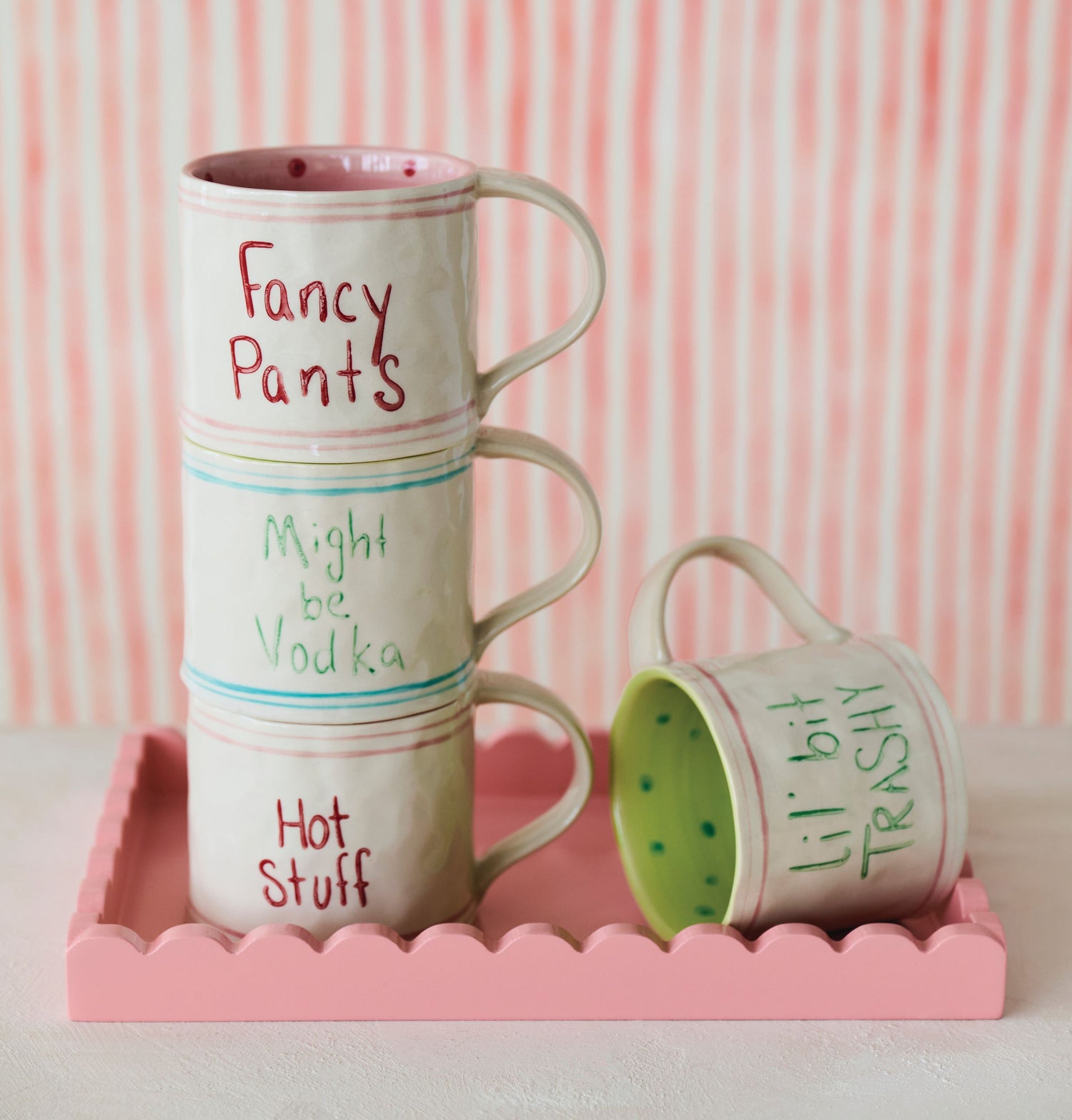 Start your day wrapped in a little happiness. These hand-painted stoneware mugs from Hazel Mazel feature cheerful written sayings and playful multicolor designs, making every sip feel extra special. Each mug has its own personality, with four unique styles to choose from, perfect for mixing, matching, or gifting.