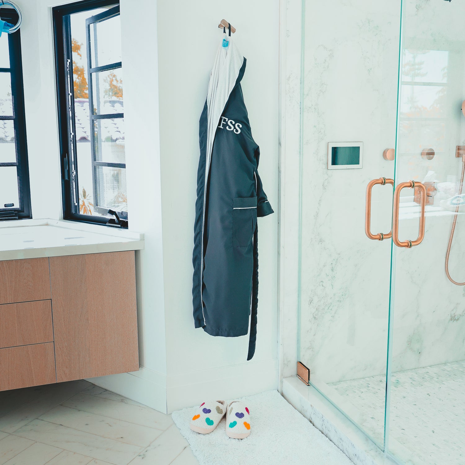 Step into style and good vibes with our plush Hearts Slippers. Made with super soft sherpa fleece and a plush cushioned sole, these house slippers are designed for comfort. The easy slip-on style makes them perfect for everyday wear, while the rubber sole keeps you safe. Whether you're looking for cozy women's slippers, sherpa house shoes, or a thoughtful gift, these slippers are a must-have. Want to elevate your alone time even more? Check out our Signature Plush Bathrobes for a truly custom experience!